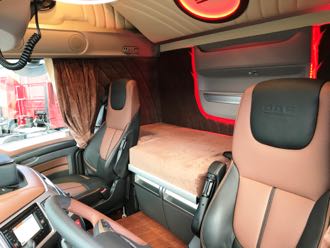 I førerhuset kan chaufføren Michael ”Micki” Hansen glæde sig over læderstue i DAF’s originale Exclusive Line, som desuden er suppleret med plysning fra Fix i Hedensted og lidt ekstra lyd fra HP Teknik i Horsens.